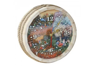 Часы из липы в форме бочки отлично вписываются в обстановку бани. На циферблате картина "На охоте".