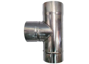 Тройник дымохода одностенный - предназначен для соединения горизонтального и вертикального участков дымохода в одноконтурном исполнении или воздуховода. Используется в схемах сборки дымоходов при необходимости снятия и переноса весовой нагрузки от дымохода с теплогенерирующего аппарата, либо на дополнительную фундаментную опору, либо на систему кронштейнового крепления к стене, при сборке сложных дымоходов от нескольких теплогенерирующихся аппаратов. Изготавливается различных диаметров и исполнений в зависимости от назначения из жарокоррозионностойких марок сталей толщинами 0,5 - 1 мм. Дымоходные трубы изготавливаются в основном из двух марок сталей: 430 и 304.