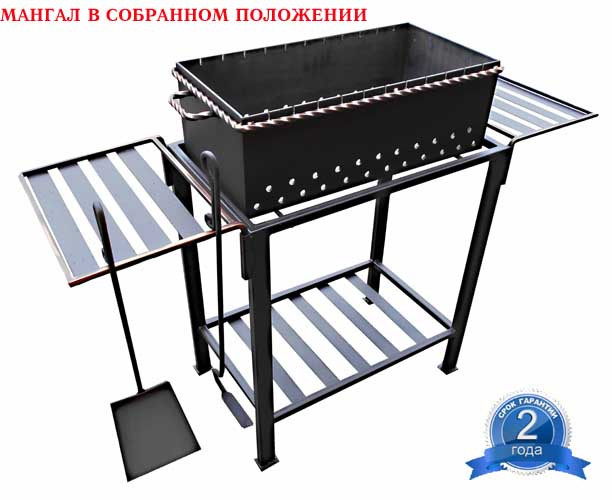 Размеры жаровни ― высота 20 см, длина ― 60 см, ширина ― 30 см, жаровня съемная -толщина металла ― 5 мм