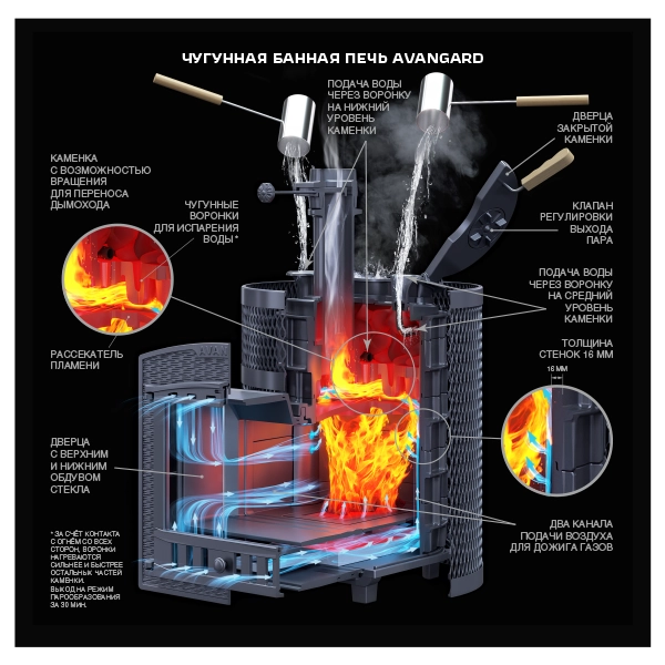 AVANGARD ЗК 25 (П2) - новый концепт чугунной теплонакопительной банной печи с прямым нагревом заряда. Корпус модульный, сборка происходит снизу вверх, модули соединяются по пазогребневой системе. Масса пароиспарителя в печи 30 – 42 кг, и он нагревается прямым контактом с пламенем. У пароиспарителя 2 поверхности с увеличенной рабочей площадью – снизу идёт нагрев огнём, а сверху поддаётся вода для пара. У печи уникальная, массивная каменка с теплонакопительными воронками, для получения легкого пара.
