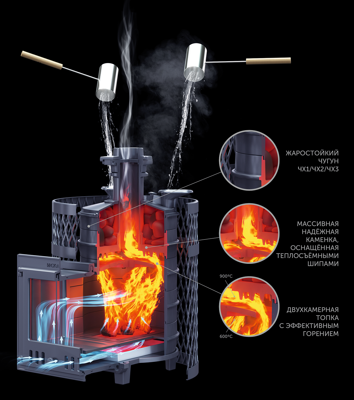 Искандер 25 - чугунная банная печь с прямым нагревом парообразователя. Печь со стенками толщиной 14 мм. Быстро нагревает воздух в парной и производит качественный мелкодисперсный пар за счёт теплоёмкой каменки, оснащённой теплосъёмными шипами на нижней поверхности.