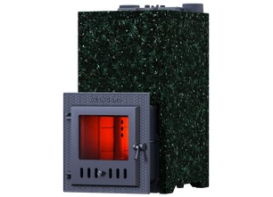 Облицовка из плит Пироксенита - эффектное и красивое обрамление банных печей "Авангард". Хорошо отполированные чёрные блестящие плиты Пироксенита с искрящимися вкраплениями зелёного цвета делают печь главным украшением парной и создают идеальный микроклимат русской бани. Облицовка регулирует уровень нагрева парной, останавливает конвекцию, сохраняет уровень влажности и останавливает жёсткое инфракрасное излучение. Этот камень нагревается постепенно, а потом на протяжении долгого времени равномерно излучает мягкое тепло.