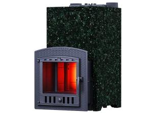 Облицовка из плит Пироксенита - эффектное и красивое обрамление банных печей "Авангард". Хорошо отполированные чёрные блестящие плиты Пироксенита с искрящимися вкраплениями зелёного цвета делают печь главным украшением парной и создают идеальный микроклимат русской бани. Облицовка регулирует уровень нагрева парной, останавливает конвекцию, сохраняет уровень влажности и останавливает жёсткое инфракрасное излучение. Этот камень нагревается постепенно, а потом на протяжении долгого времени равномерно излучает мягкое тепло.
