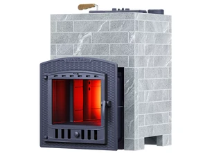 Талькохлорит – это плотный, прочный и термически устойчивый горный камень, идеально подходящий для изготовления облицовки. Прекрасно накапливает тепло и имеет красивый внешний вид. Его цвет неоднородный, а включает в себя всю палитру серого цвета с мелкими вкраплениями желтого и зеленого. Облицовка представляет собой кирпичики талькохлорита с краями, обработанными фаской. Печь в такой облицовке дарит приятное тепловое излучение, которое идеально подходит для создания режима русской бани.