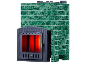 Облицовка из кирпичиков змеевика - это простой и эффективный способ создать режим русской бани. Облицовка представляет собой плитки зелёного камня с краями, обработанными фаской. Из-за этих краёв облицовка имеет чёткий рисунок, который полностью имитирует настоящую кирпичную кладку. Эта облицовка также, как и облицовка из классического кирпича, останавливает жёсткое инфракрасное излучение и конвекцию, легко собирается/разбирается и не требует никаких специальных навыков при сборке.