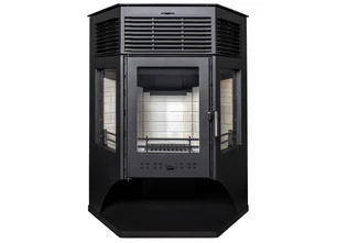 Печь-камин Москва 12 может размещаться у стены либо в углу комнаты. Универсальное подключение дымохода (сверху либо сзади). Печь оснащена призматической дверцей с крупными стеклами.